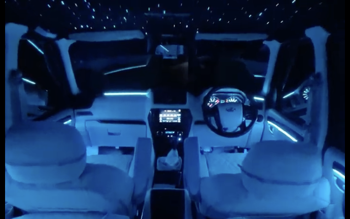 Customized app-controlled ambient lighting installation, instantly transforming the rugged cabin into a futuristic, mood-lit lounge.